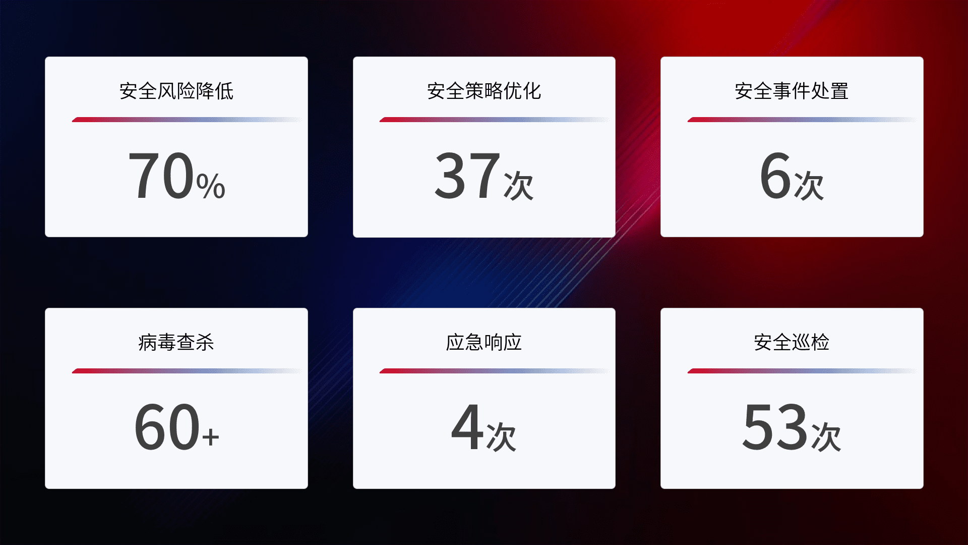 提供全面的安全事件报告体系,,包括处置报告、、周报、、季度和年度总结,,结合持续监控,,,帮助客户深入了解网络安全状况。。。